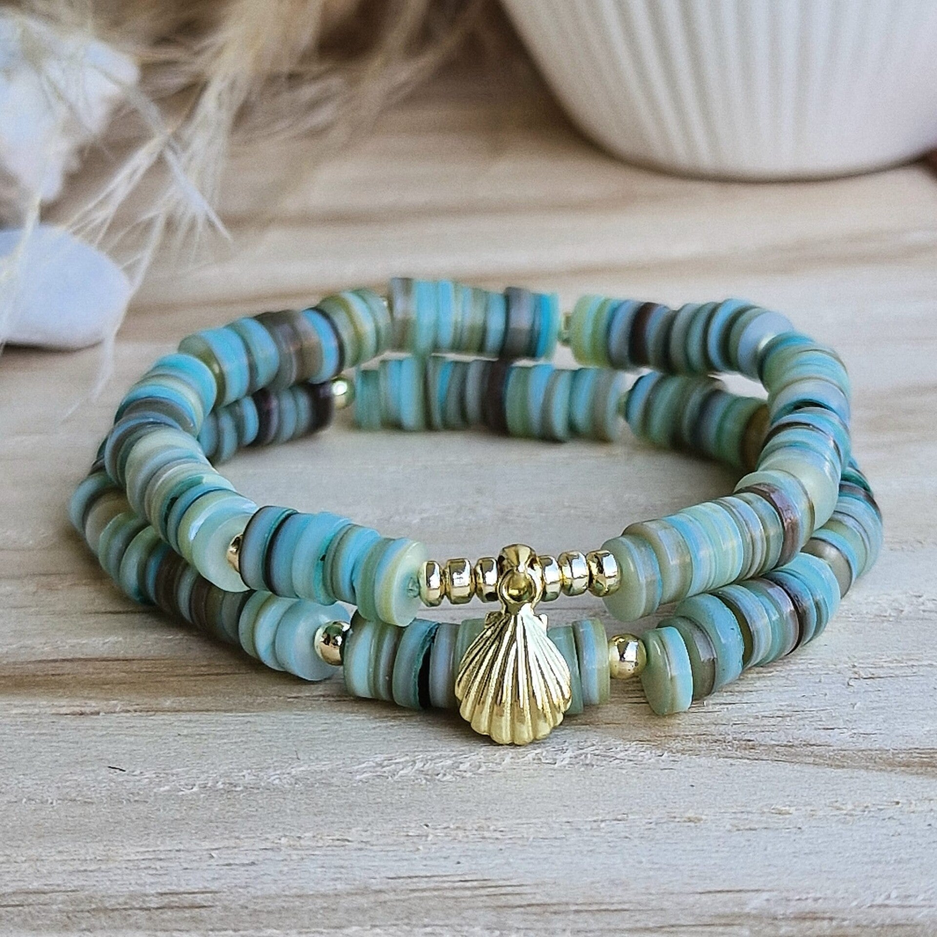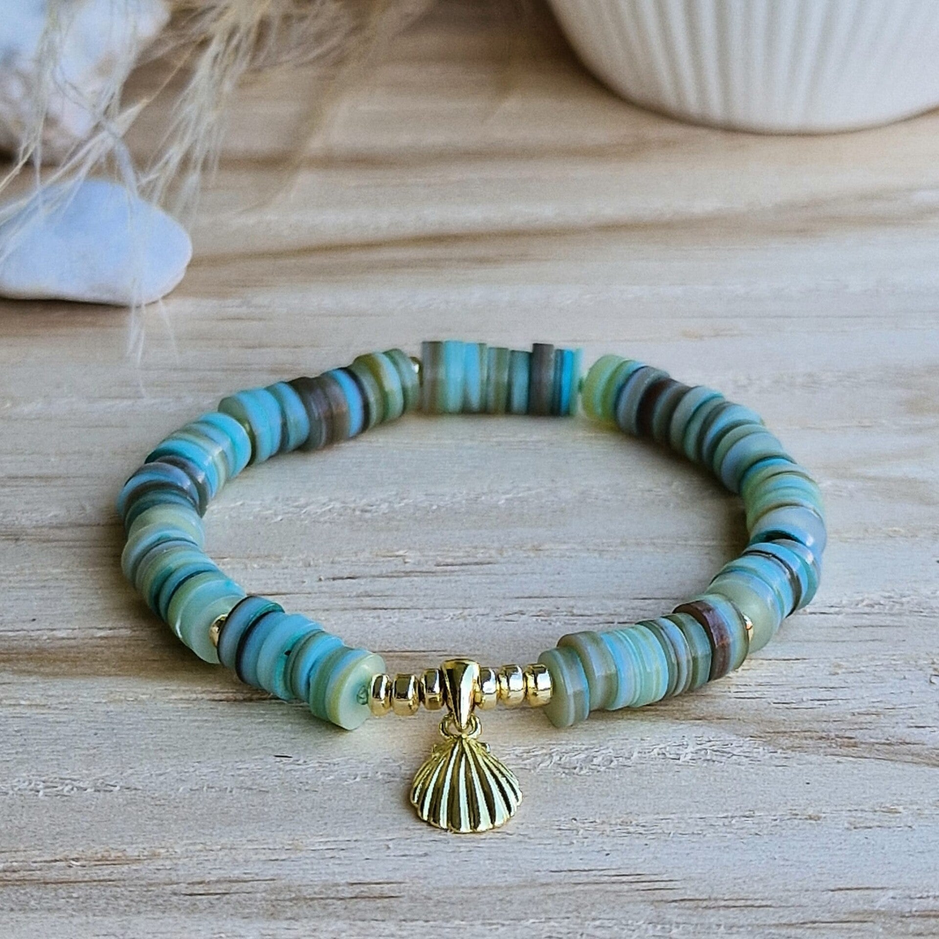 Dieses coole blaue Muschel-Armband mit Goldanhänger ist ein absoluter Hingucker! Es präsentiert sich in den Farben des Meeres und ist ein echtes Schmuckstück.