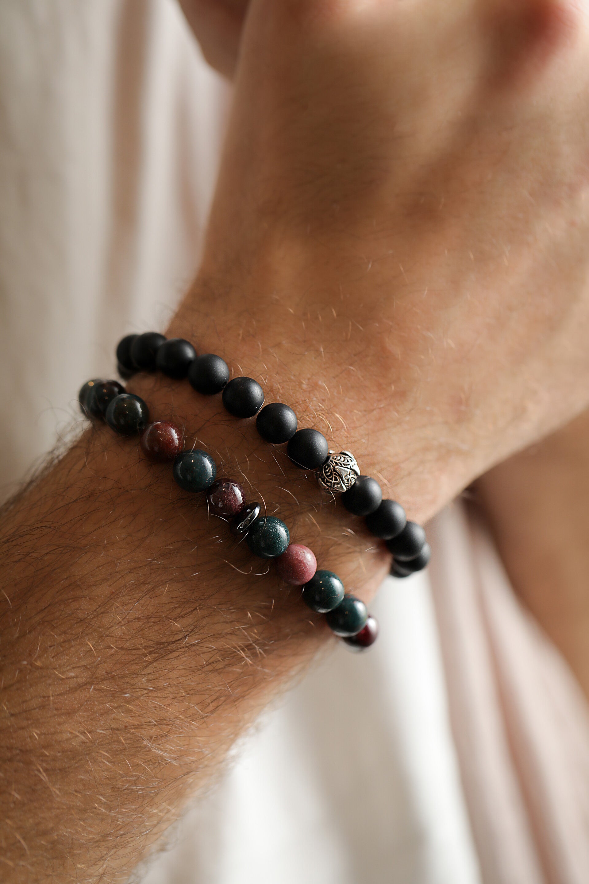 Seine Mischung aus dunkelgrünem Heliotrop, der für starken Realitätssinn steht, braungoldenem Granat für Willenskraft und rotem Jaspis für Dynamik ist einfach fantastisch. Zudem kommt Rhodonit dazu, der für die Angst vor Veränderungen steht und für Selbstvertrauen sorgt.