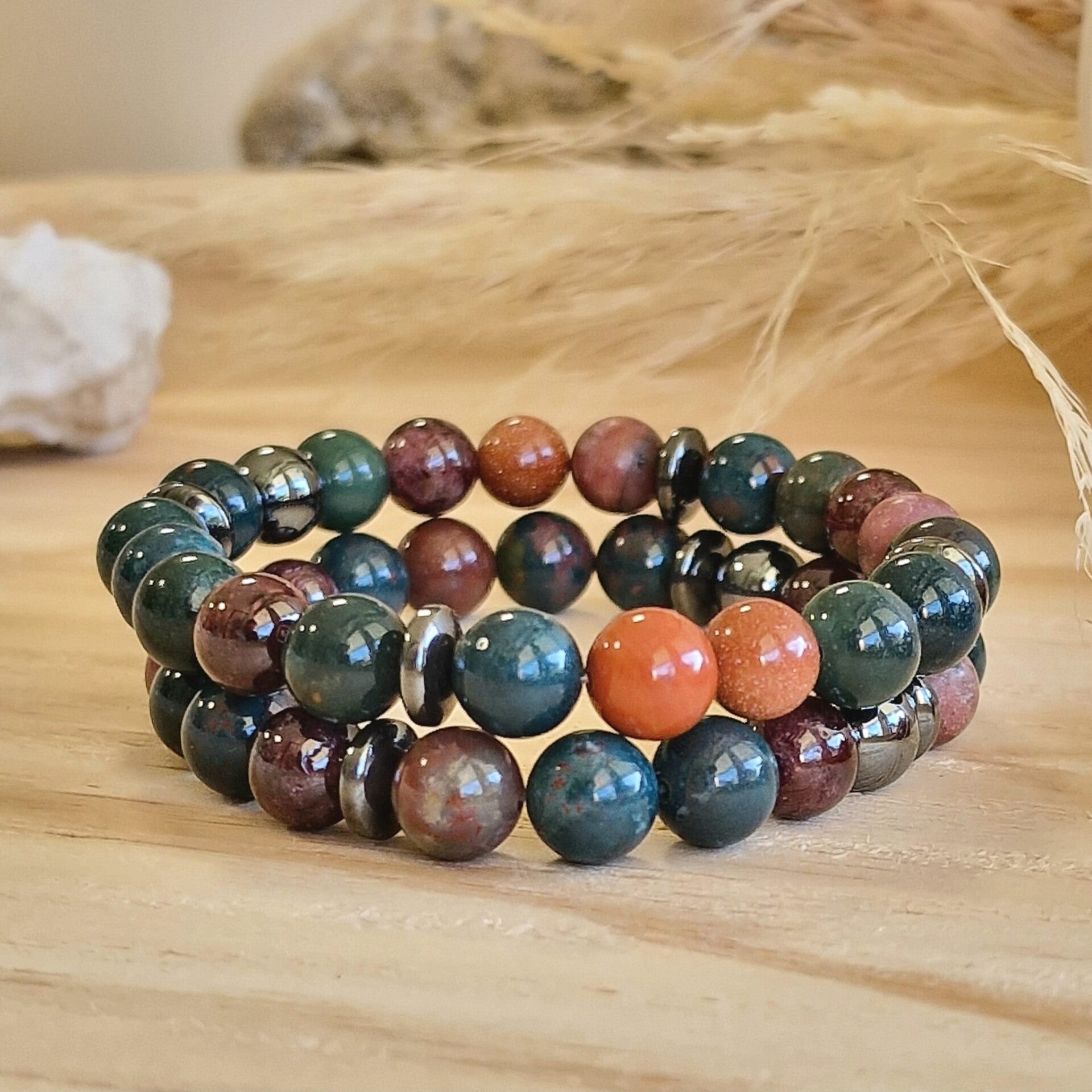 Es ist aus Heliotrop, Granat, Jaspis, Rhodonit, braunem Goldfluss in 8 mm Perlen sowie Hämatit-Rondellen gefertigt und auf stabilem Schmuck-Elastik aufgezogen.