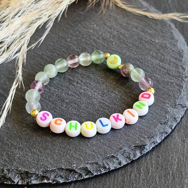 Das Armband ist aus elastischem Modell mit Fluorit und Sterlingsilber vergoldet. Du kannst die Buchstaben in deiner Wunschfarbe wählen, die wir dann passend zum Band aufziehen.