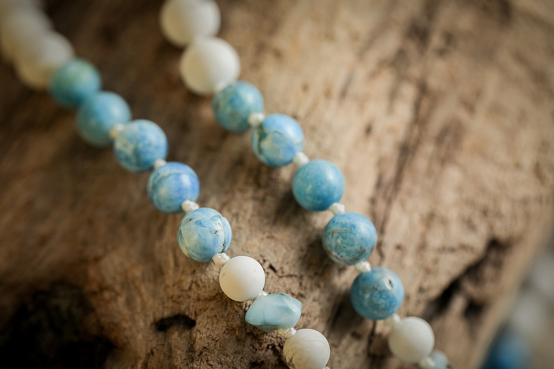 Die Mala Sommerwind vereint drei hochschwindende Edelsteine. Heller Apatit, weisser Magnesit und Larimar ergänzt durch 925er Silber als feines Leitmetall. Sie wirkt wie ein warmer, sanfter Wind, der den Geit klärt, das Herz öffnet und die Seele wieder weicher atmen lässt.