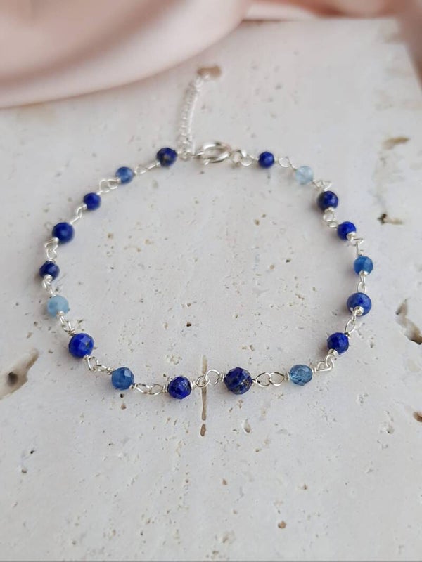 Ein liebevoll gefertigtesArmband in der Rosary-Technik mit echter Edelsteinvielfalt: Lapislazuli, Aquamarin und Disthen bringen Farbe und Harmonie ans Handgelenk.