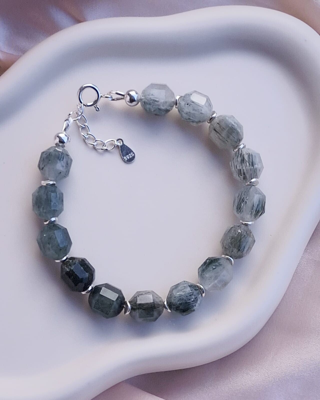 Die Ohrringe Malia verbinden schlichte Elegnaz mit der besonderen Ausstrahlung eines seltenen Natursteins. Die facettierten Aktinolith-Perlen zeigen einen sanften grau-grün-bläuchlichen Schimmer und sind von feinen Turmalin Einschüssen durchzogen, die dem Stein eine lebendige Tiefe verleihen.